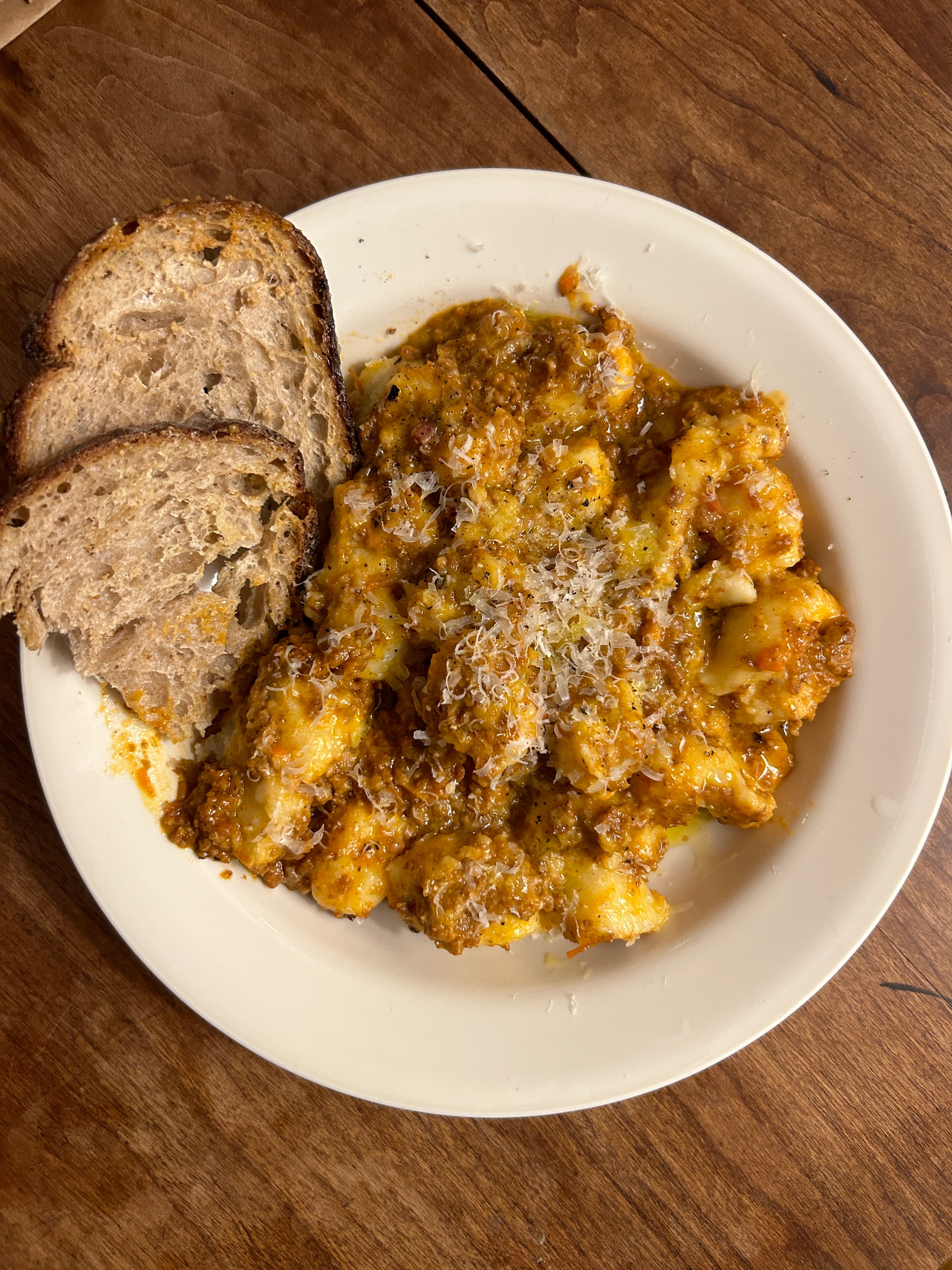 I instantly knew the gnocchi didn’t have enough binding by the fact that they started to break apart slightly in the boiling water, but I tried to be chill about it. I was barely able to move them around in the pan of bolognese for fear of turning them into just mashed potatoes. It was a rational fear, because that’s kinda what happened.