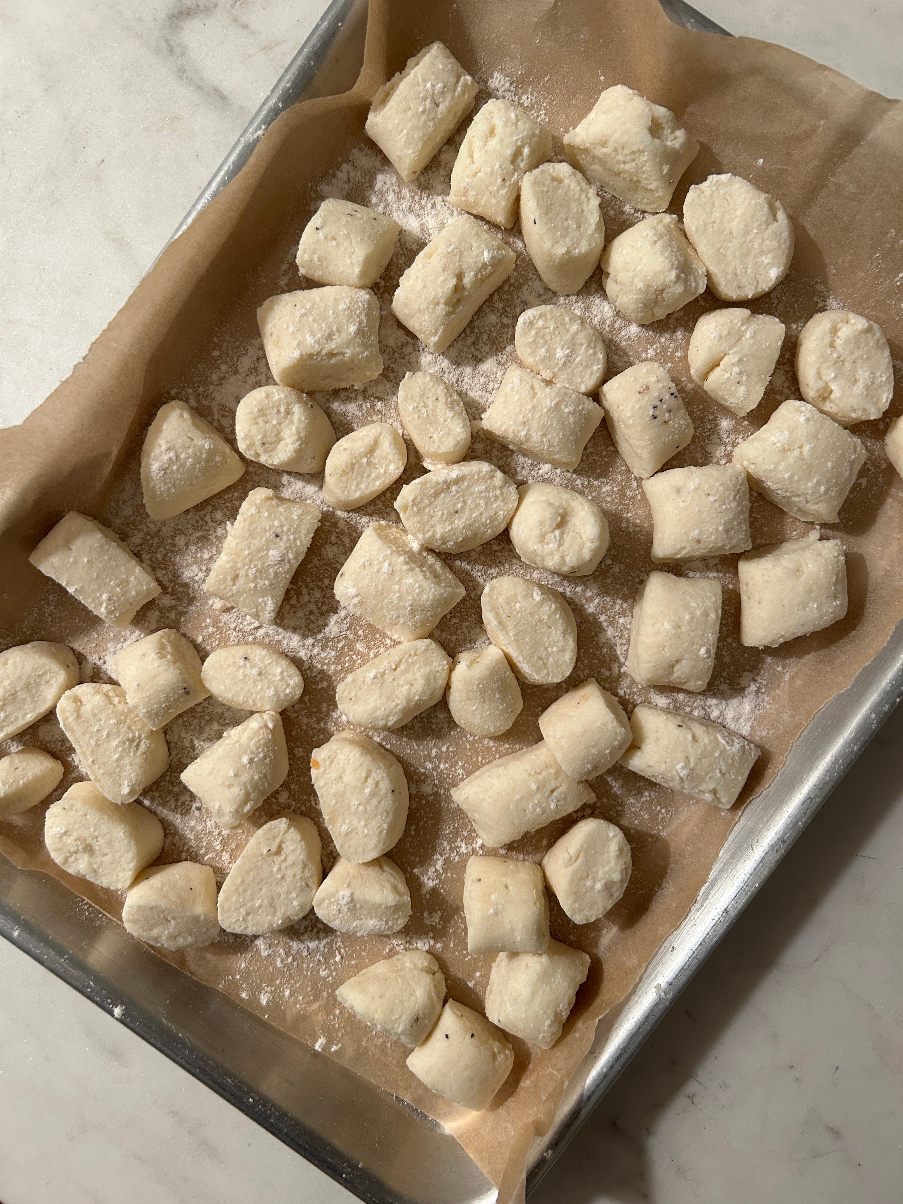 I cut off little nubbins from the logs and tossed them all on a baking sheet dusted with some flour. I defrosted a pint of bolognese I had made on my cookbook shoot like 2 weeks ago, and John let his skill set shine by bringing a pot of water to boil.
